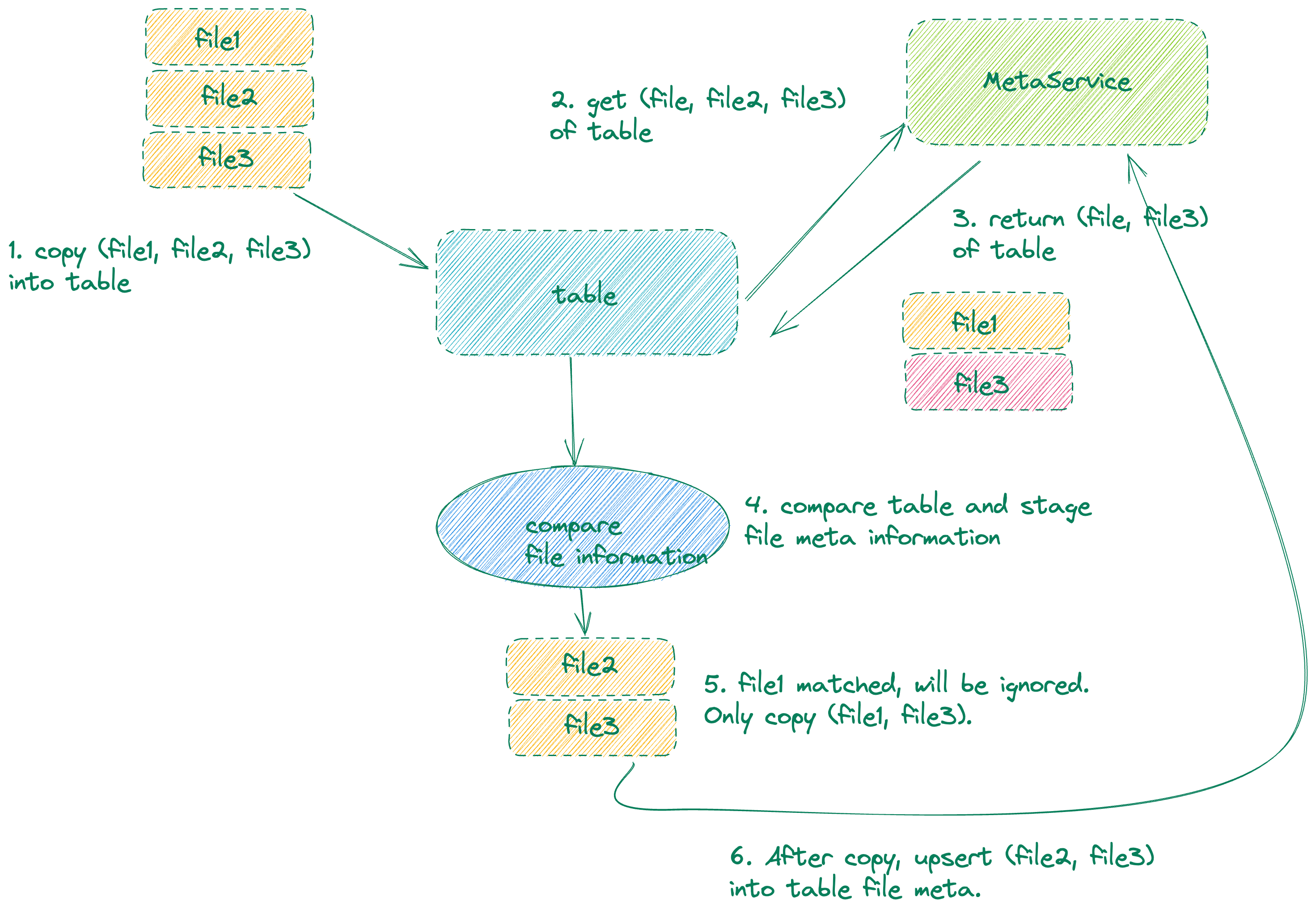 Compare the table stage file information with stage file information, and found that file1 has not been changed, so file1 will be ignored in this copy operation, and (file2,file3) will be copied.