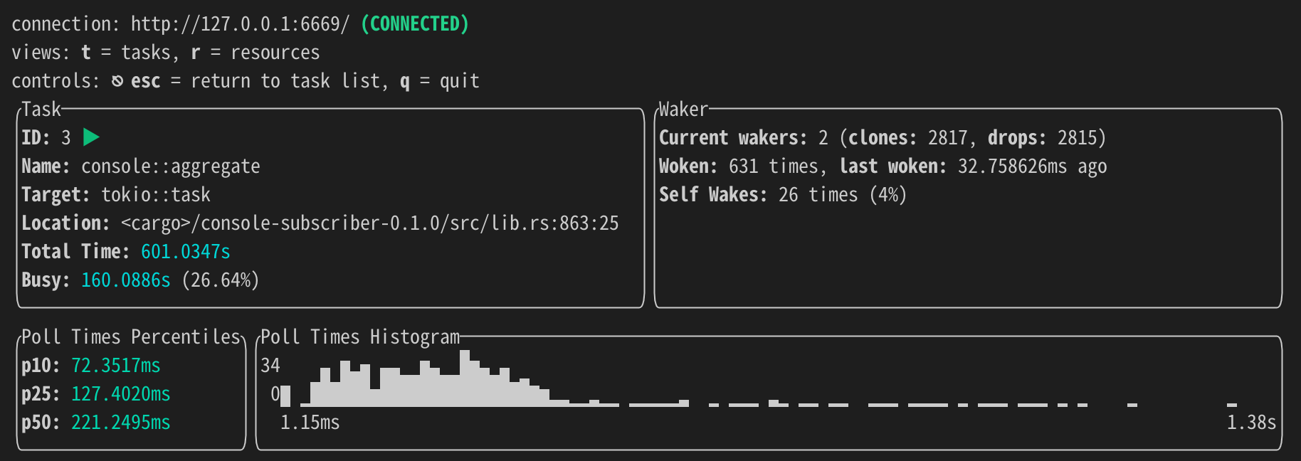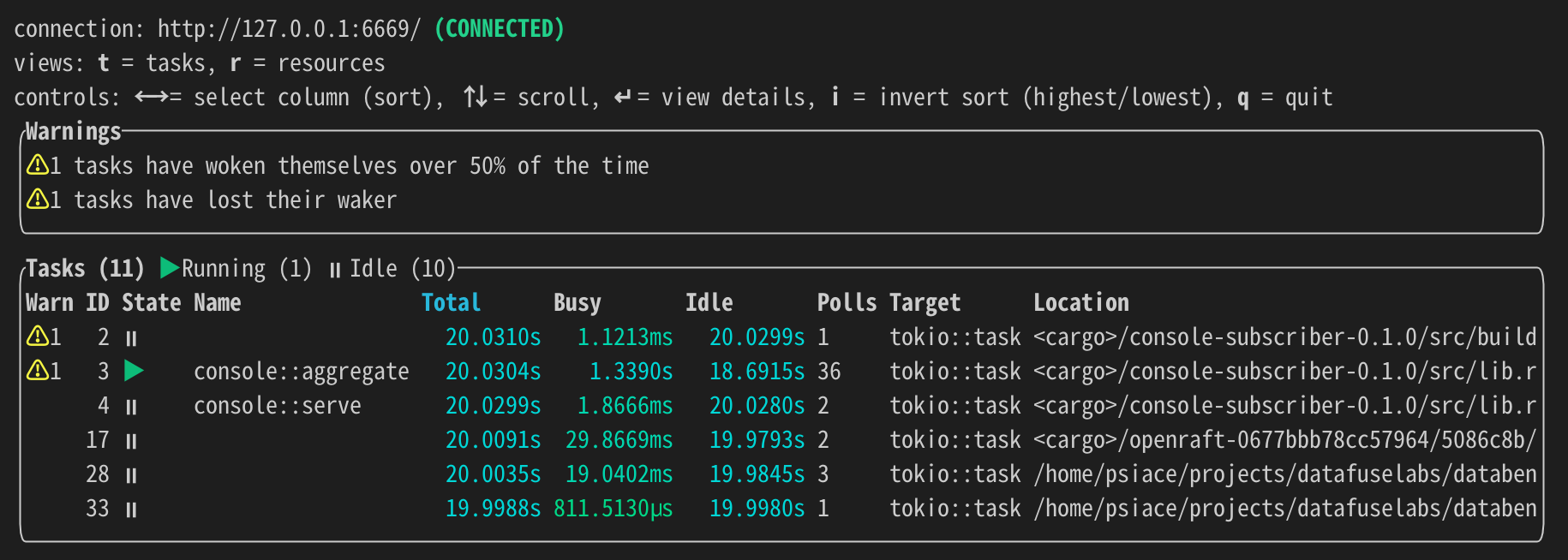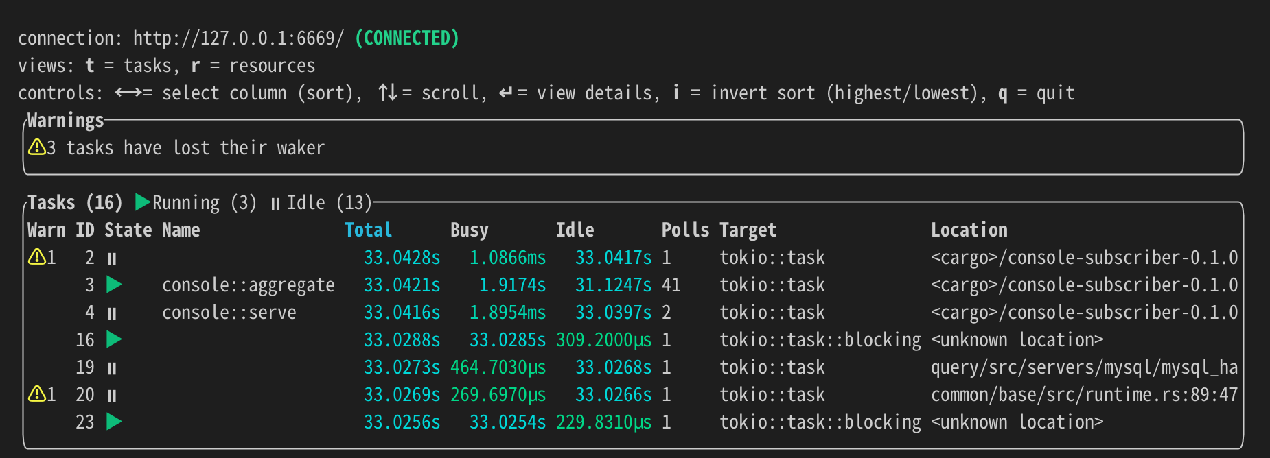 tokio-console http://127.0.0.1:16667 # for query console, http://127.0.0.1:16667