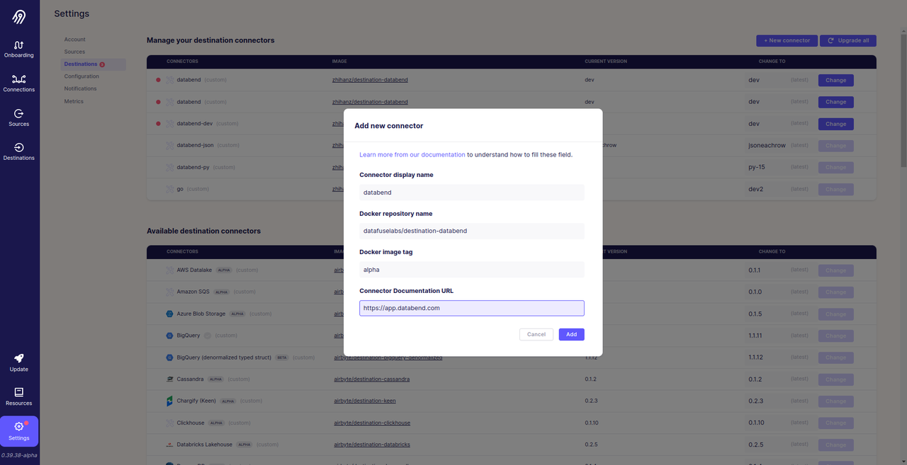 Our custom destination image is datafuselabs/destination-databend:alpha