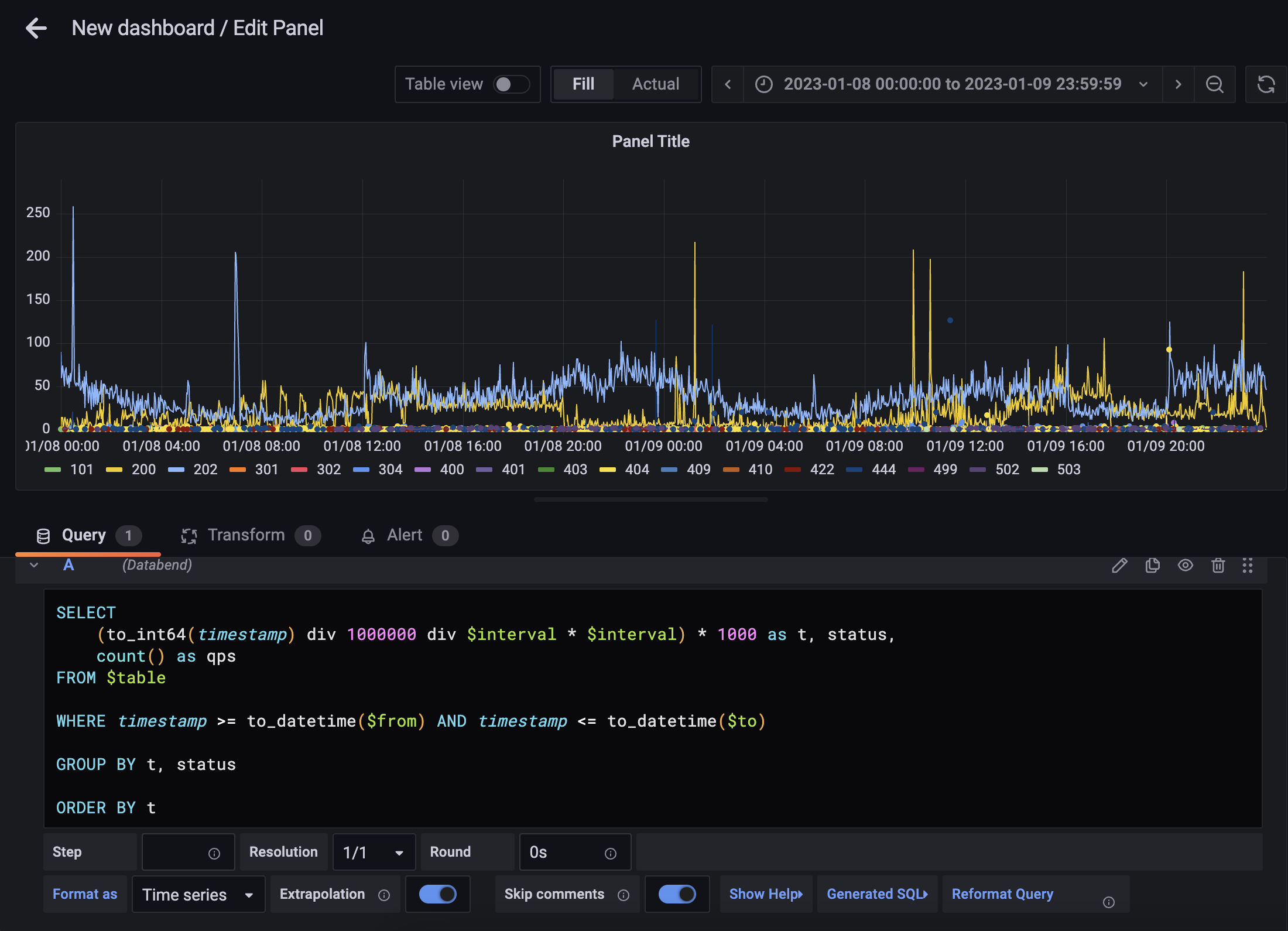 Create a new dashboard with a new panel, select the Datasource created in previous step.